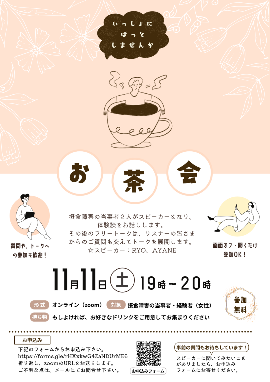 摂食障害の当事者2人がスピーカーとなり、摂食障害からの回復の道のりについて、体験談をお話しします。その後のフリートークは、リスナーの皆さまからのご質問も交えてトークを展開します。